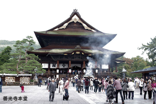 長野駅前から100メートルほど先の末広町交差点を右折し、1キロメートル半ほど歩くと大門の交差点に出ます。横断歩道を渡ったあたりから町の雰囲気が変わってきます。善光寺の香りがしてくるのでしょう。 しばらく歩くと、道の左側に郵便ポストがあります。円筒型の昔懐かしいポストで、和風の旅館らしき建物の前にあります。近づいて見ると、「善光寺郵便局」の看板が出ています。どうやら、かつての旅館をそのまま利用した郵便局のようです。 ほかの建物も、ほのかに時代を感じさせてくれます。どうやら通り全体で、古い町並みを大切にしているようです。 さらに行くと、「善光寺」の表示のある信号に出ます。道向こうの正面に道幅の狭い通りがまっすぐ伸びていて、入り口付近の左右に石灯籠が立っています。かつてはここに二天門があったと聞きました。ここから善光寺本堂まで、ずっと石畳の参道が続きます。 右側の石灯籠の足もとに、「長野市道路元標」があります。おそらく記念碑的なものだと思いますが、善光寺を中心として長野市が発展してきましたという気持ちを表しているのでしょう。 参道の左側は「大本願」と称する浄土宗の寺院です。ご住職は尼僧で、尼公上人と崇められています。 その先の左側に「大勧進」と称する天台宗の寺院があります。ご住職は貫主(かんす)と呼ばれています。 善光寺には檀家もありませんし、住職も居住していません。大本願の尼公上人と、大勧進の貫主が、善光寺の住職を兼ねています。善光寺の長い歴史の中で、このような形が確立してきたのです。 宗派の異なる二人の住職が居ますので、善光寺の朝のお勤め(お朝事)は、二度行なわれます。 二天門跡から仁王門までの右側には、宿坊が並んでいます。 仁王門の先、山門の手前に、源頼朝に由来する駒返り橋があります。仁王門から駒返り橋の間は、仲見世通りです。居並ぶ店々のもうひとつ裏にも宿坊が並んでいます。全国各地から訪れる信仰者の皆さんが、これらの宿坊に泊まって善光寺を懇ろに参拝します。 仲見世通りの中頃、左側にお地蔵さんが座っています。その右側に小路があって、その奥に宿坊があります。世尊院釈迦堂です。ここの御本尊は、お釈迦さまの涅槃像です。 駒返り橋を過ぎますと、右側に六地蔵さんと、濡れ仏と呼ばれる大きなお地蔵さんが、こちらを見ています。 左側には放生池(ほうじょういけ)があり、大勧進の門から橋が架かっています。この池は防火用水なのだそうです。 橋で二つに仕切られた池の善光寺側には蓮があり、季節になると花を咲かせます。これは、大賀ハスだそうです。昭和26年に大賀一郎博士が発見した、縄文時代に咲いていたという古代ハスです。 山門をくぐると正面に善光寺本堂が聳えています。質素ではありますが、さすがに重厚です。古い時代から、多くの人びとを抱擁してきた風格を感じさせます。善光寺本堂は撞木(しゅもく)づくりだと説明されますが、本堂を仰ぎ見ただけではその意味が分かりませんでした。善光寺本堂の航空写真を見た時に分かりました。 撞木というのは、半鐘などを打ち鳴らすために使うТ字形の木の棒ですが、善光寺本堂の棟の形が、まさしくТ字形をしていました。正面から見た場合、外陣(げじん)の棟が縦向き、内陣(ないじん)の棟が横向きになっていたのです。 本堂の前に据えられた大香炉の煙で身を浄めて、本堂正面の階段を登ります。 善光寺は、私を、どのように迎えてくれるでしょうか。(浪) 出典:清飲検協会報(平成31年4月号に掲載) |