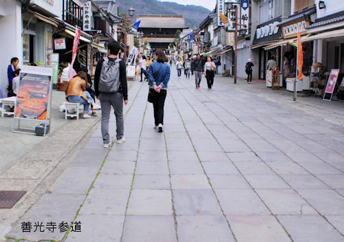 善光寺は、たびたび火災に見舞われましたが、そのたびに再建されてきました。 江戸時代の初めにも大火があり、再建するときに、本堂が現在の位置に移されました。宝永四年(1704)のことでした。 善光寺参道は、二天門跡から本堂前まで、450メートルぐらいと思われますが、当初は、何の整備もされていないむき出しの土の道でした。雨が降れば泥んこになります。寒いところですから、雪でも降れば凍りついたでしょうし、雪融けにはぬかるみになったでしょう。乾燥しやすい季節には土ぼこりが舞い上がったのではないでしょうか。参拝者は難儀だったと思います。 正徳3年(1713)、腰村(現在の西長野)にある西光寺の住職単求(ぜんぐ)の寄進で、本堂前に敷石が詰められました。 正徳4年(1714)、二天門跡から山門下まで、400メートルあまりの参道にも、敷石が詰められ、石畳の道となりました。寄進したのは、江戸中橋上槙町(現在の日本橋三丁目)の豪商大竹屋平兵衛でした。