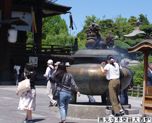 本堂前に置かれた大香炉に線香を投げ入れて煙を身に浴び、本堂に向かいます。本堂正面の階段を上ったところが回廊です。回廊の中ほどに太い柱が並んでいるというちょっと珍しいつくりで、かなりな広さです。参詣者が多いので、このようなつくりにしたのかもしれません。回廊から大きな敷居を越えますと、そこが外陣(げじん)です。目の前に、太鼓の乗った妻戸台(つまどだい)があります。その右側には大きな花瓶に松が生けられています。親鸞松です。さらにその右にびんずる尊者の座像があります。その脇を回り込んで中に入りますと、大きな賽銭箱の前に出ます。 いくばくかの賽銭を投げ込んで礼拝し、顔を上げますと、須弥壇はずっと奥の方で、手前には内陣が広がっています。参拝者がゆっくりとお参りをする場所で、かつてはここでおこもりをしていたのだそうです。 内陣の向こうは、内内陣です。ここには仏具が並び、僧侶たちの活動する空間です。 内内陣の奥は須弥壇です。ご本尊は中央に祀ってあるものと思い込んでいましたが、そうではありませんでした。中央から一つ左に寄ったところに祀られているのでした。 中央から右側は御三卿の間で、ここに三体の座像が並んでいます。中央は本田善光(よしみつ)卿、右側が妻女の弥生(やよい)御前、左側が息子の善佐(よしすけ)卿です。 本田善光は、難波の堀江で御本尊に呼び止められ、御本尊を信濃までお連れした人です。弥生は善光の奥方、善佐は息子です。 善佐は一度死出の旅に出ましたが、善光寺如来のはからいで、現世に戻ってきました。その途中で皇極(こうぎょく)天皇を見かけ、そのことを聞いた善光が善光寺如来にお願いして、皇極天皇を助けてもらいました。 このことに感動した皇極天皇が、水内(みのち)の芋井(いもい)に伽藍を建ててくれました。ここから、善光寺が始まったわけですから、善光卿・弥生御前・善佐卿は、善光寺の開山にあたるわけです。 御三卿の間の左側に、瑠璃壇があって、そこに善光寺如来が祀られています。 善光寺如来は一光三尊阿弥陀如来で、絶対秘仏です。厨子に収められ、瑠璃壇に安置され、瑠璃壇の前には、鳳凰と龍の二枚の金襴の戸張が懸かっています。この戸張は、法要などの時に、ほんの短時間、上げられる時があるそうですが、戸張が上がってもご本尊を見ることはできません。 善光寺では、ご戒壇巡りということがなされます。須弥壇の上手側の袖のあたりに、地下に降りる階段があります。ここを降りるとまったくの暗闇です。何も見えません。参拝者は、右手で右側の壁に触ったまま進みます。やがて、金属の輪に触れます。この輪に触れることによって、善光寺如来と結縁されるのだと聞きました。ここからさらに進むと、出口の明かりが見えます。 この地下道は、須弥壇の周囲を一巡りしているのだそうです。 昔は、白装束、白足袋に、新しいわらじを履いて、お戒壇を巡ったのだそうです。このわらじは持って帰り、命終したとき棺に収めてもらったのだそうです。善光寺如来と縁づいたわらじを履いて、善光寺如来のもとに急いだのでありましょう。 お戒壇めぐりをした私は、内陣に戻って正座し、もう一度須弥壇にご挨拶をしました。 江戸時代の寛永年間に大火で焼失し、徳川幕府の肝いりで再建された伽藍のこの場所に、数知れぬ善男善女が座って、御本尊を仰ぎ見てきたと聞けば、不信心な私でも、いくらかは敬虔な気持ちになったようです。(浪)