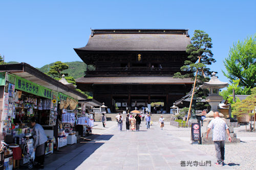善光寺仁王門を過ぎると、駒返り橋までの200メートルほどが、仲見世通りです。おみやげ屋さん、仏具屋さん、食べ物屋さん、写真屋さんなどなど、たくさんのお店が並んでいます。 仲見世通りを過ぎて、駒返り橋を渡りますと、目の前に山門があります。