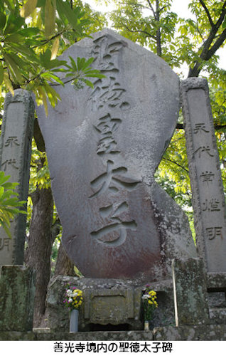 仏教公伝を契機に始まった蘇我稲目・物部尾輿の対立は、そのまま子の蘇我馬子・物部守屋に持ち越されました。このとき、厩戸皇子(聖徳太子)は、蘇我馬子に協力しました。 争いは武力衝突に発展し、蘇我氏の軍勢が物部氏の館に攻め込みました。しかし、軍事に長けた物部氏に、かえって圧倒されてしまいます。窮地に立った厩戸皇子は、ぬるでの木で四天王の像を作り「この戦に勝利したら、四天王をお祀りするお寺を建てます」と誓願しました。 その甲斐があったのでしょうか、厩戸皇子に仕える舎人(とねり)の一人が、物部守屋が大木に登って蘇我氏の軍勢に矢を射かけているのをみつけ、忍び寄って射落としました。総大将を失った物部氏は総崩れとなり、戦いは崇仏派の蘇我氏の勝利に終わりました。 これによって、一光三尊阿弥陀如来が世に出る条件が整ったことになります。その意味でも、厩戸皇子は、重要な役割を担ってくださったと言えます。 厩戸皇子は、誓った通り、難波の堀江の近くに四天王寺を建立しました。 難波は、善光寺に縁の深い場所です。ある伝承では、百済から海を渡った一光三尊阿弥陀如来が、難波の堀江に着いたとあります。 善光寺縁起では、一光三尊阿弥陀如来が、物部氏によって、難波の堀江に捨てられたとなっています。 物部守屋を倒した厩戸皇子は、難波の堀江に、一光三尊阿弥陀如来をお迎えに上がりましたが、阿弥陀如来は、今はその時ではないとお断りになりました。その後、信濃の本田善光が、難波の堀江を通りかかったとき、一光三尊阿弥陀如来に呼び止められてお告げを受け、信濃にお連れしたというわけです。 こうしたことから、一光三尊阿弥陀如来と厩戸皇子すなわち聖徳太子とは、切っても切れない関係にあると考えられるようになったようです。 善光寺には、かつて、聖徳太子を祀った太子堂があったそうです。現在は太子堂はありませんが、「聖徳皇太子」と大書された大きな石碑があります。
